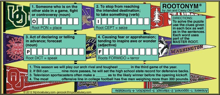 AARP News Webletter, January 4, 2008: "Expand your vocabulary with the Rootonym Puzzle - using the same root for four different words. Win points with correct answers. Beat the clock and gain extra points."